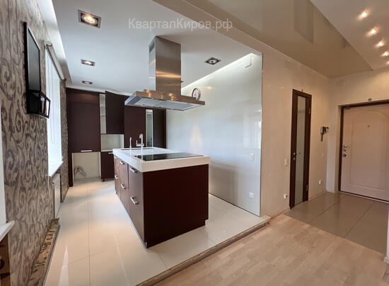 - В квартире был сделан современный ремонт: паркетный пол, в прихожей керамогранит, многоуровневые потолки, большой совмещенный санузел. Оставляем кухонный гарнитур с островом. Полы с подогревом.