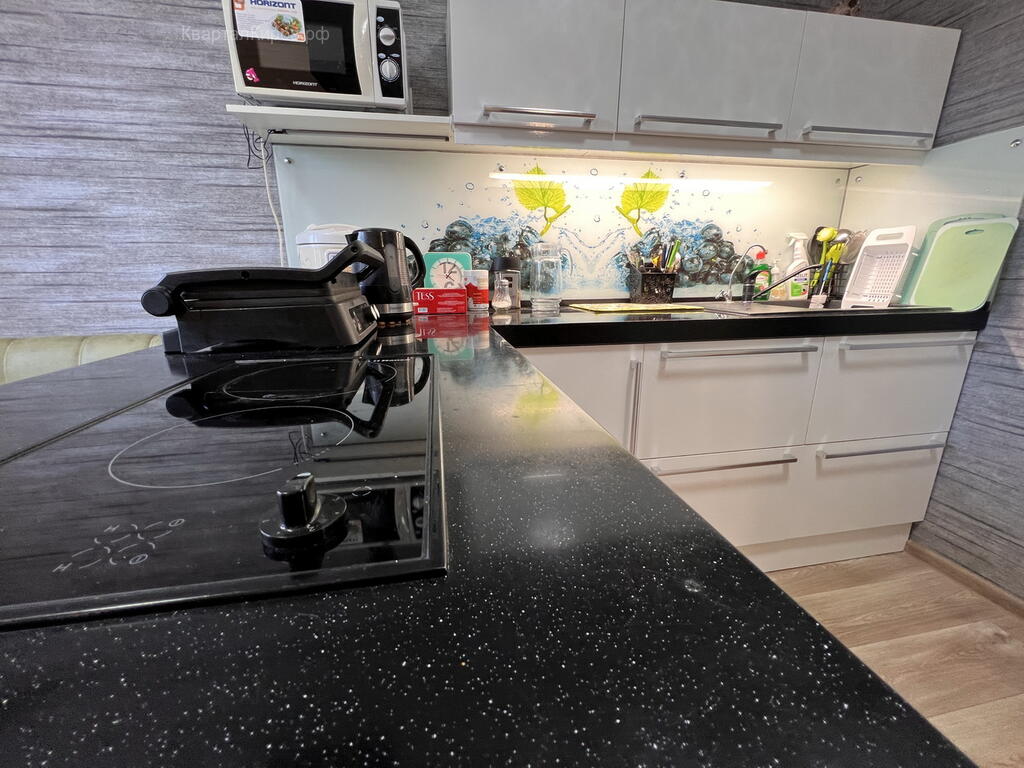 - Оставляем дорогой кухонный гарнитур со столешницей из искусственного камня и качественной встроенной техникой.