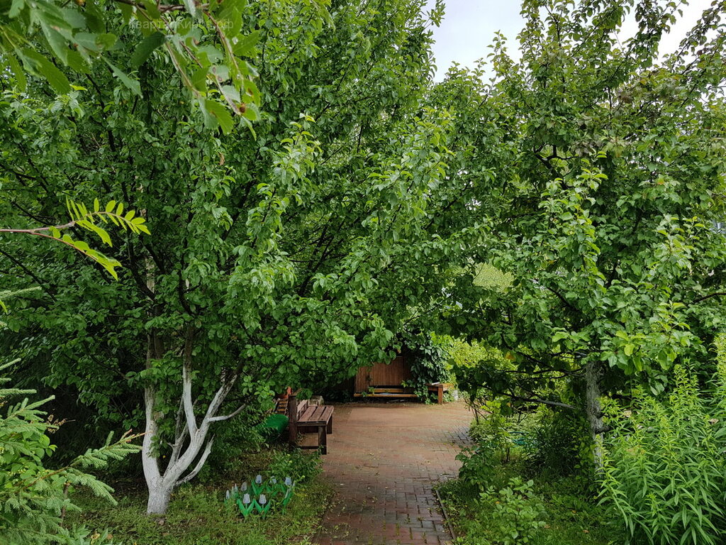- На участке много зелени, под деревьями летняя беседка.