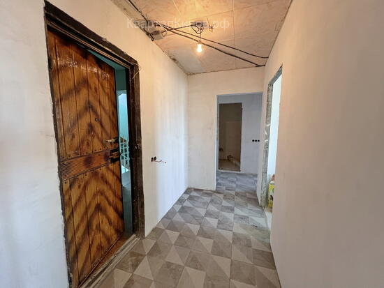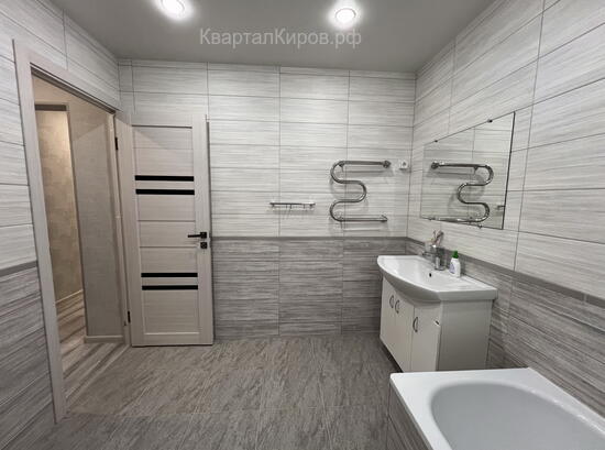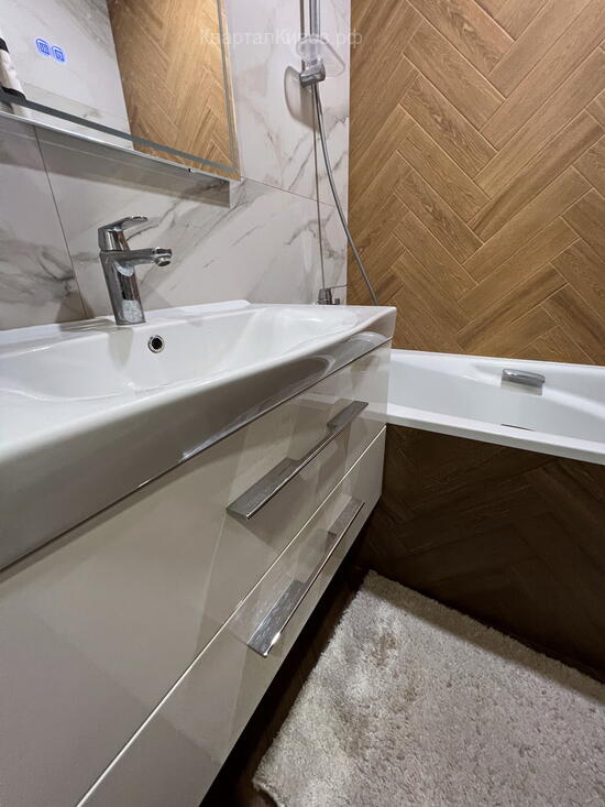 - В квартире сделан ремонт: плитка в ванной, красивый кухонный гарнитур. Осталось установить межкомнатные двери и натяжные потолки.