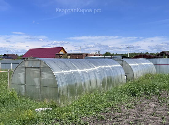 Участок разработан частично: огород под овощи, 2 теплицы размером 8м*3м, молодые кусты вишни, смородины, малины.