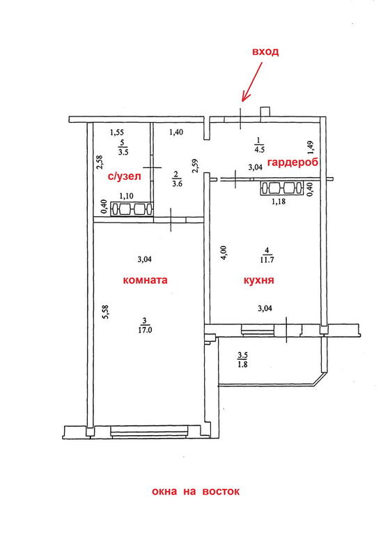 - Пластиковое окно в большой комнате, балкон застеклен. Оставляем кухонный гарнитур с новой колонкой-автоматом (всегда горячая вода).