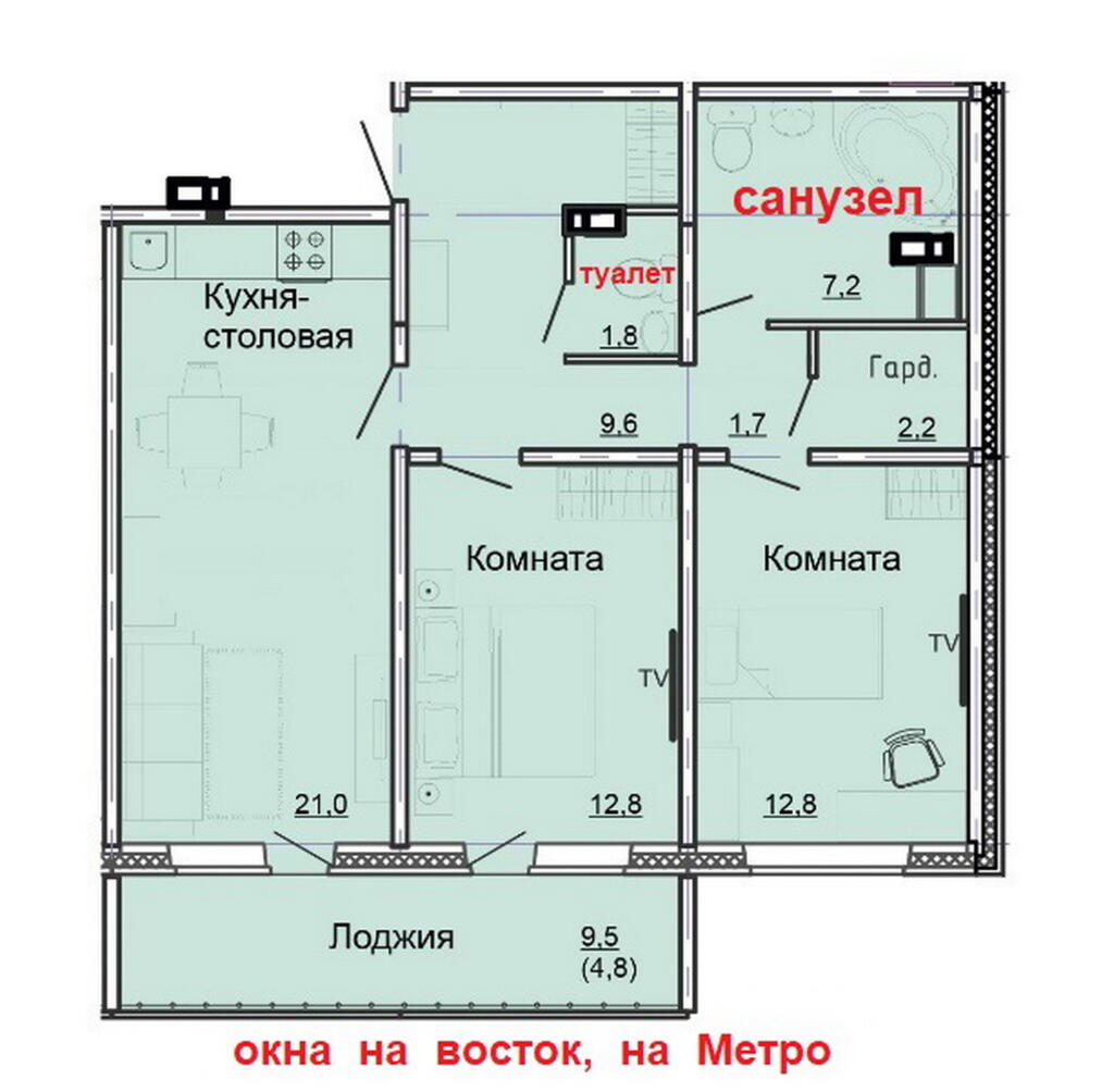 - Удачная планировка - просторная кухня-гостиная 21 м2, две спальни по 12.8 м2, большая лоджия с пластиковым остеклением, два санузла, гардеробная.