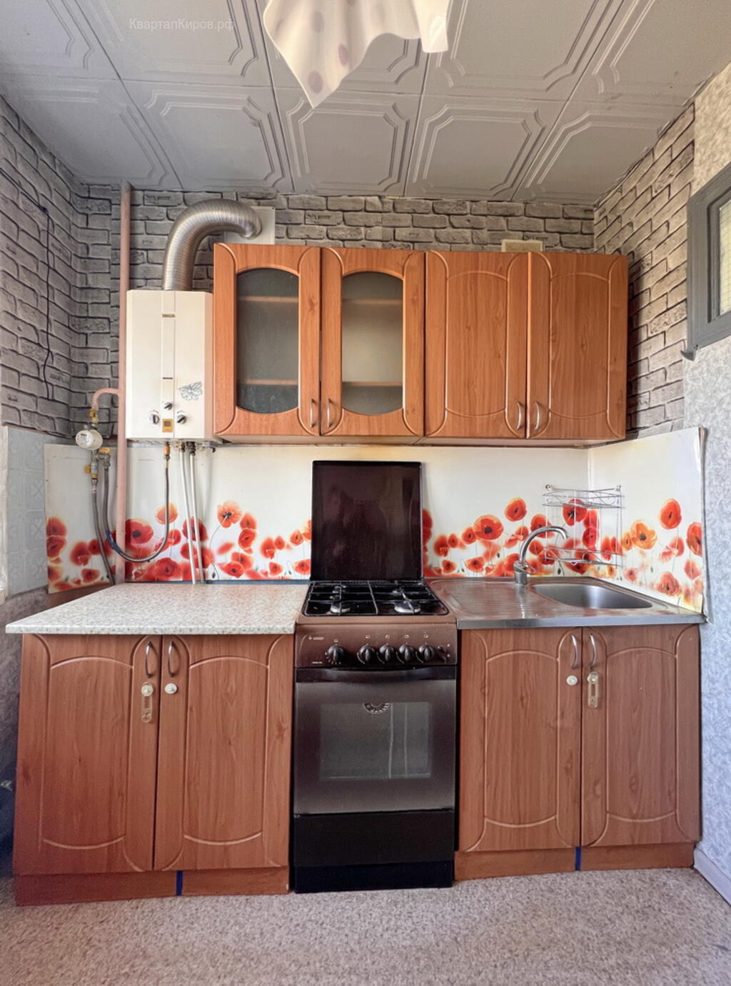 - Пластиковое окно в большой комнате, балкон застеклен. Оставляем кухонный гарнитур с новой колонкой-автоматом (всегда горячая вода).