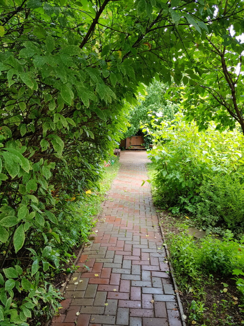 - На участке много зелени, под деревьями летняя беседка.