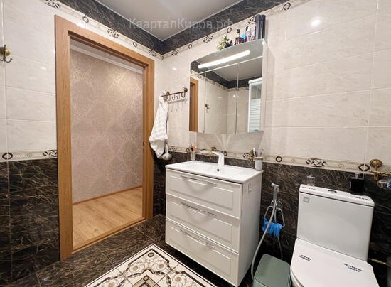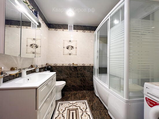 - Сделан отличный ремонт. Делали для себя, на материалах не экономили. На полу керамогранит и ламинат, санузел в плитке.