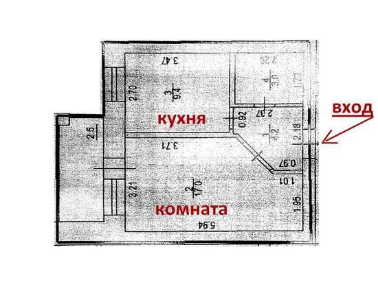 - Общая площадь 35 м2, комната 17 м2, кухня 9,4 метров, лоджия 3 метра.
