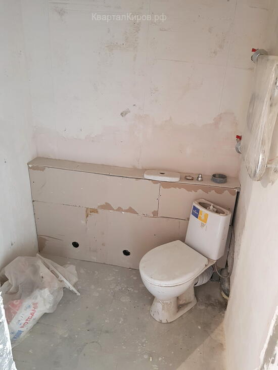 - В квартире начат ремонт: сделана стяжка, разведена электрика, установлены розетки, установлены унитаз и полотенцесушитель, стены выравнены и зашпаклеваны.