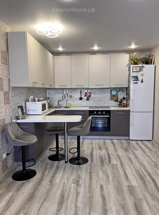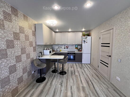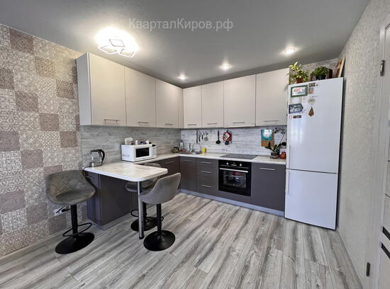 - В квартире был сделан современный ремонт: паркетный пол, в прихожей керамогранит, многоуровневые потолки, большой совмещенный санузел. Оставляем кухонный гарнитур с островом. Полы с подогревом.