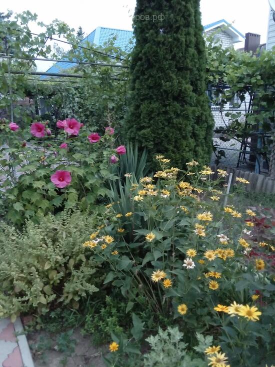 На участке много зелени, растут персик, виноград, груша, хвойные - туи, сибирская ель, сосна.