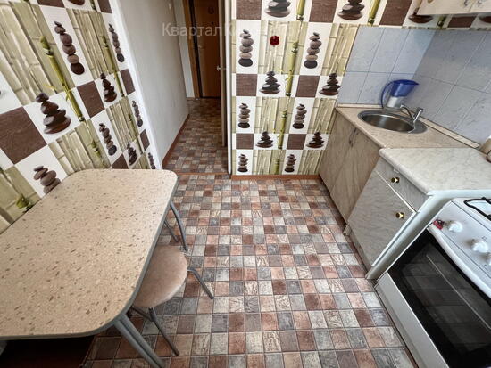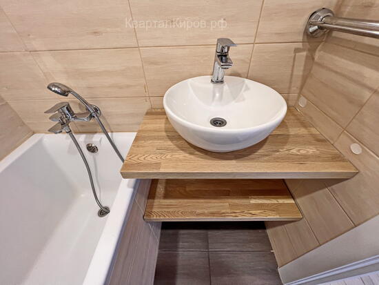 - В квартире сделан ремонт: плитка в ванной, красивый кухонный гарнитур. Осталось установить межкомнатные двери и натяжные потолки.